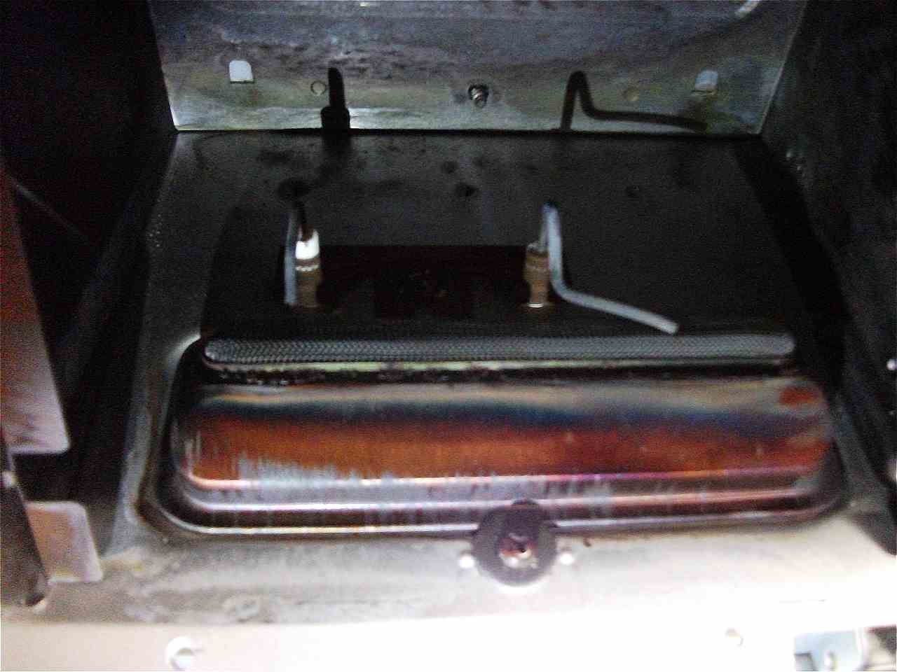 本体内部の金属製カバーを外すと、右側にL字型の点火プラグがあるのが見えます。本来は黒っぽい金属色ですが、故障の原因となるシリコーンが付着していると、写真のように表面が白く粉を吹いたような状態になります。