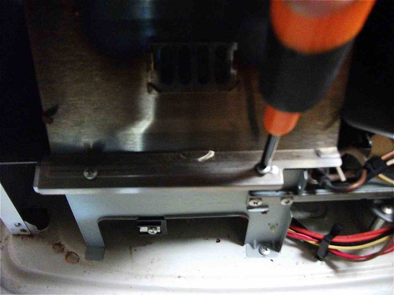 このカバーも下側をネジで固定されていますが、上側は鉤爪(かぎづめ)で本体に引っ掛かっている構造となっています。無理に外そうとすると爪が折れてしまいますので、慎重にスライドさせて取り外します。